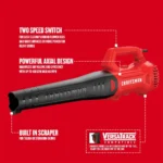 This corded axial blower is built for user-friendly operation and robust performance. It features a high-performance motor designed to clear away yard waste, grass clippings, and leaves with efficiency. For versatility across different surfaces, the blower includes a 2-speed switch, allowing the user to select the appropriate air flow when cleaning around delicate areas like flower beds or blowing heavier debris off hard surfaces. A notable convenience feature is the built-in scraper located at the end of the nozzle, which helps to loosen wet, tough, or stubborn debris for a more thorough cleanup. For storage, the tool is VERSATRACK™ compatible, featuring an integrated hook for convenient wall mounting (system sold separately).