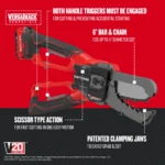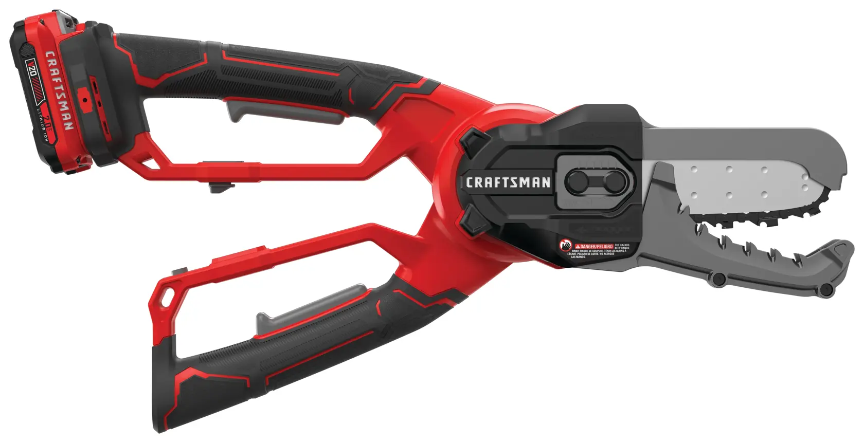 The CRAFTSMAN V20* Cordless 6-Inch Compact Chainsaw/Lopper Kit is a powerful, innovative tool designed to simplify limb clearing and pruning. It uniquely combines the ease and safety of traditional scissors/loppers with the cutting performance of a chainsaw. Powered by the V20* 2.0Ah Lithium Ion battery, it delivers cordless convenience for fast, clean cuts.